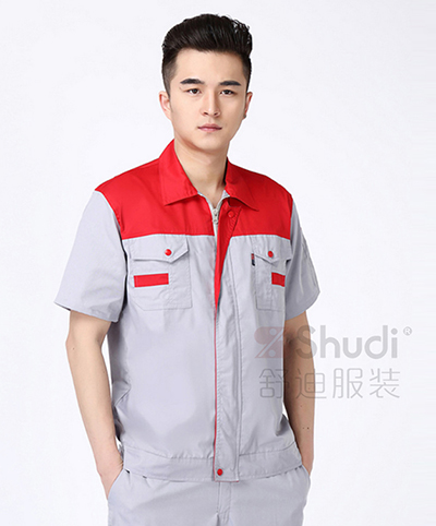 这款工作服款式图片名称是上红下灰色,红色拼接灰色 ,形象设计方面给人一种干净利落、精神清爽的感觉
